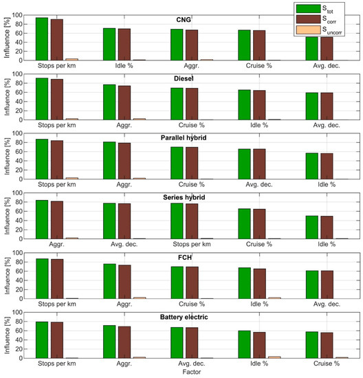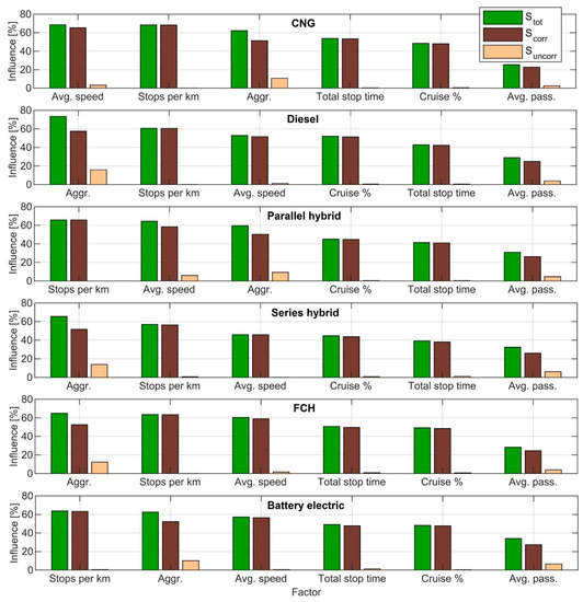 It can be seen in Figure 14 that aggressiveness had the highest amount of uncorrelated influence on consumption. Aggressiveness had the highest amount of uncorrelated influence on consumption of the diesel bus (15.88%) and the lowest amount on consumption of the parallel hybrid (9.28%). The results indicate that, between the conventional bus types, the diesel bus is more sensitive to aggressiveness of the driving maneuvers. Among the hybrids, the parallel hybrid appears the least influenced by aggressiveness based on these results. The average passenger load had the highest amount of uncorrelated influence on the consumption of the BEB (6.64%) and the lowest on the consumption of the CNG bus (2.54%). The results are indicative of the fact that the passenger load is proportionally less significant with the conventional bus powertrains than with the hybrid and battery electric powertrains. This is because the driving cycle properties are comparatively more influential with the conventional models because of the lower and more varying tank-to-wheels efficiency and the lack of regenerative braking.