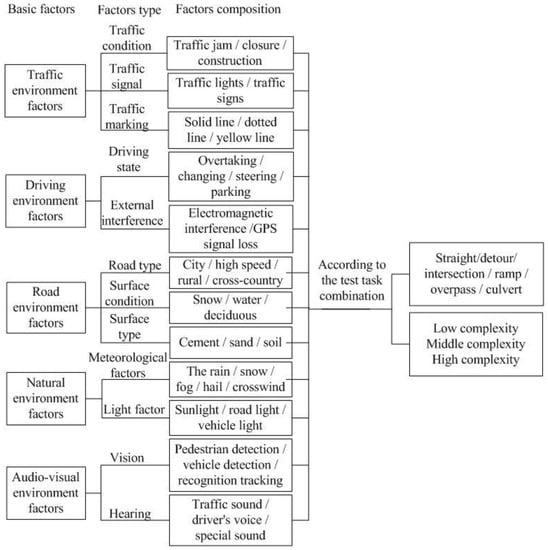 By analyzing the relationship between environmental factors and key technologies of the UGV, the environmental impact factors are classified and all kinds of basic environmental factors and their components are defined. The basic environmental factors can be divided into the road environment factors, the weather environment factors, the driving environment factors, the traffic environment factors, the audio-visual environment factors and so on. Through the combination of various environmental factors, the establishment of various real road environments is studied, and a theoretical model of the test environment is formed to achieve the accurate simulation of the complex real environment. The research scheme for the construction of the theoretical model of the test environment is shown in Figure 2.