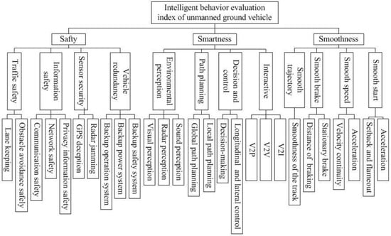 UGVs have great potential in reducing traffic accidents, alleviating traffic jams, improving roads and vehicle utilization and so on. In real life, there are many traffic violations such as drivers changing roads illegally, running red lights and so on, which lead to traffic accidents. The UGV can accurately observe the traffic rules, such as choosing the best path to change lanes, accurately identifying the traffic lights and making the corresponding decisions. The location of each other is detected by vehicles’ interaction, location sharing, and radar sensors to avoid collisions. Like electric vehicles [1,2], UGVs have great advantages in improving energy efficiency, and they have become a research hotspot for many research teams. The intelligence level of the UGV is the key factor in determining the quality of the UGV. Developing a scientific and reasonable evaluation system can promote the rapid development of some key technologies of the UGV.