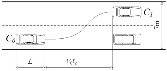 represent the longitudinal displacement, the longitudinal velocity, the longitudinal acceleration, the lateral displacement, the lateral velocity and the lateral acceleration of the vehicle. The longitudinal displacement and lateral displacement of the initial state are all 0. The lateral displacement of the target state is the width of the lane, the longitudinal displacement of the target state should consider the safety factors, and the safety distance between the moving vehicle and the static obstacle must be determined. The safety distance model based on headway [24] takes account not only of the speed of the vehicle but also the distance between vehicles. This model is simple and feasible. Therefore, this paper selects the safe distance model based on headway.
