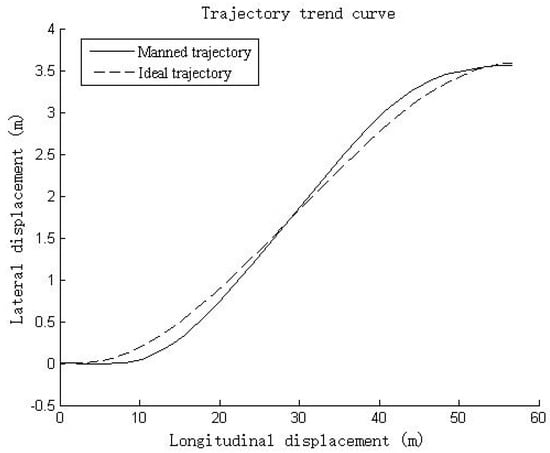 The ideal trajectory of a UGV for obstacle avoidance is calculated as shown in Figure 5. The graph shows that the curvature of the ideal trajectory is continuous, without changes, and the curvature of the start and the end of the lane change is zero. By comparison, it can be seen that the ideal trajectory is smoother than the driving trajectory. Collecting the actual driving trajectory of UGV (see Figure 6), the deviation time series of the actual driving trajectory and the ideal trajectory are calculated.