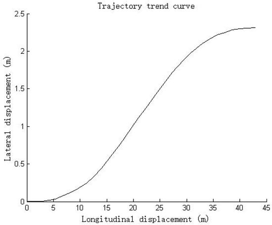 In this paper, the quantitative process of an UGV driving trajectory is introduced by an example of obstacle avoidance. We have found an excellent driver who has been driving for 10 years. He has hardly had a traffic accident and has had fewer than five traffic violations. An excellent driver’s driving trajectory is collected for the static obstacle avoidance, as shown in Figure 5. The process of vehicle lane changing can be seen intuitively by the figure, and the driving parameters such as lateral displacement and longitudinal displacement can be easily obtained.