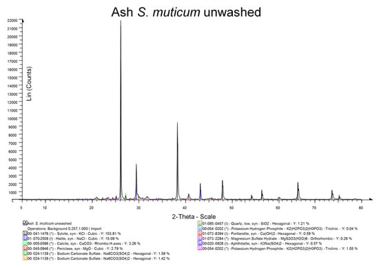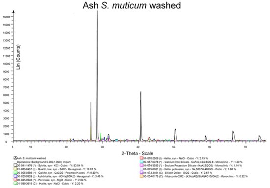 The results of the XRD analyses are shown in Figure 2 and Figure 3. Washing reduced chloride salts, both sodium and potassium, and inorganic sulphates (sodium carbonate sulphate and magnesium sulphate hydrate), but water hardness salts were increased (calcite). The Mohr salt analysis (NaCl) also showed that the washing significantly (p < 0.05) reduced salt, with the unwashed ash containing 51.5% (SD 1.4%) and the washed ash containing 42.5% (SD 3.5%).