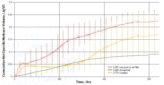 The total methane yield after 28 days from the unwashed sample was 0.225 L CH4 g−1 VS (SD 0.046) and 0.177 L CH4 g−1 VS (SD 0.085) for the washed. Although this is a reduction of 21% in methane yield, the difference in methane yield between the washed and unwashed samples was not statistically significant (p > 0.05). Figure 4 shows the net biomethane production of gas production over 28 days. A two-way ANOVA to examine the effect of washing and time and their interaction on daily cumulative methane production from the BMP test found that washing, time, and the interaction between washing and time all had a statistically significant effect on cumulative methane yield. It would appear that washing modifies the time course of biomethane production by significantly delaying the initial rate of microbial digestion to produce biomethane, but washing does not statistically significantly change the final total (ultimate) methane yield.