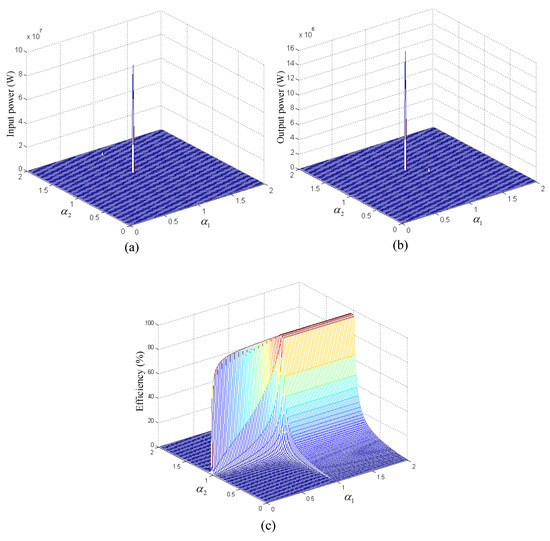 Substituting Equations (6) and (11) into Equations (8)–(10), the input power, output power, and transmission efficiency at the resonance of system are