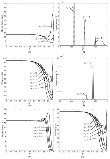 β, the variation of output power and transmission efficiency with