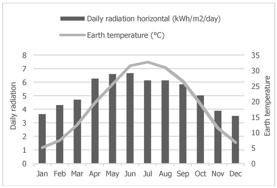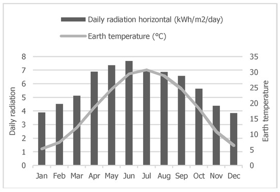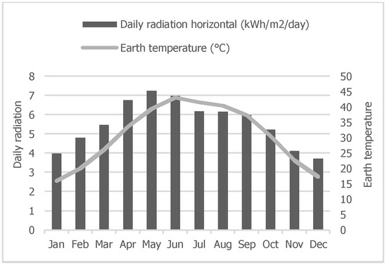 A typical off-grid PV system includes a PV module, system controller, battery storage, DC to AC inverter and load or demand. PV panels receive solar energy and pass it to the system controller after converting it to DC. The DC then supplies the load through a DC-AC inverter. The amount of electricity generated through a PV system is heavily dependent on the amount of solar radiance received in the surrounding area. However, other factors need to be considered, such as panel efficiency, optimal tilt angle and regular maintenance [48]. Furthermore, it is important to account for losses incurred during DC to AC conversion. There are several models to predict solar electricity yield on a tilted PV from horizontal irradiance. The annual solar irradiance data on a horizontal surface has been taken from NASA’s database, and the potential of electricity generated annually by solar PVs, (kWh) is calculated using Equation (6) [49]: