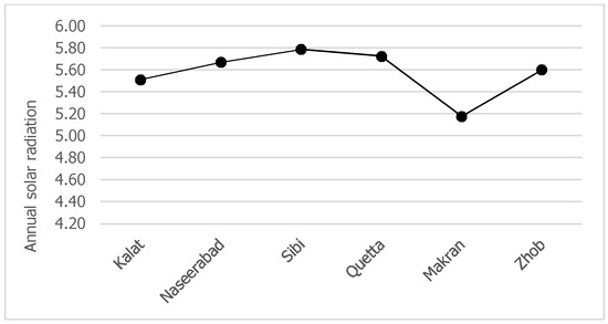 The values of daily solar radiance received in all the six regions show the best potential to generate solar energy. Figure 4, Figure 5, Figure 6, Figure 7, Figure 8 and Figure 9 show the daily solar radiation received on a horizontal surface in each region. The average annual solar radiation received on a horizontal surface in all regions is shown in Figure 10. The Sibi region receives the highest annual solar radiation (5.79 kWh/m2) followed by the Quetta (5.72 kWh/m2), Naseerabad (5.67 kWh/m2), Zhob (5.60 kWh/m2), Kalat (5.51 kWh/m2), and Makran (5.18 kWh/m2) regions respectively.