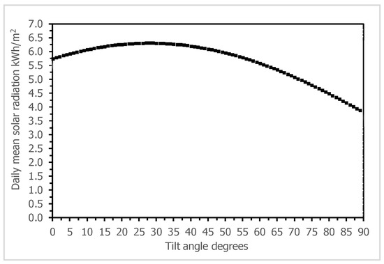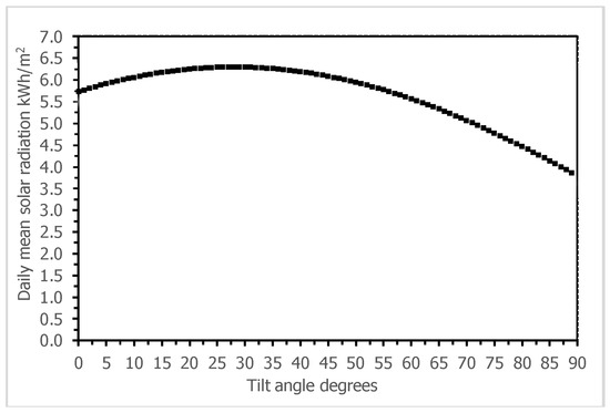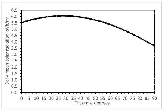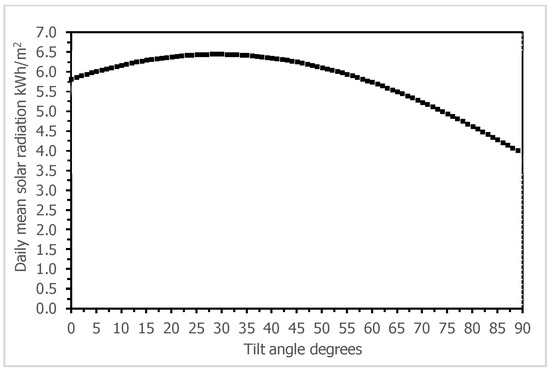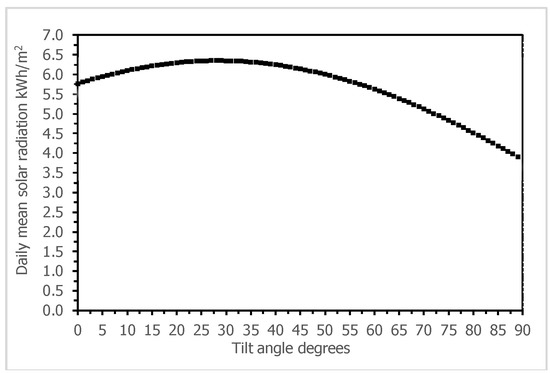 Solar radiation is normally measured on a horizontal surface. Solar panels receiving direct radiation have high energy yield. Therefore, solar panels are often tilted to increase the irradiance incident. To find out the optimum tilt angle is thus necessary to maximize solar yield [42]. One of the best ways to increase the solar yield is by applying an active solar tracker on solar panels. Active solar trackers keep changing the orientation of solar panels to receive maximum energy during the day. However, active solar trackers come with a high cost and consume extra energy for tracking [43]. In addition, solar trackers are complex to be used in rural areas. Therefore, it may be more feasible to change the tilt angle of PV panel manually than applying solar trackers. Several methods are used to calculate the optimum tilt angle for maximizing the irradiance incident from of horizontal radiation [44,45,46]. Here, a titled surface receives a direct beam, some radiation is absorbed and some is diffused, the rest is rays reflected off the ground, thus the global irradiance incident on a tilted surface has following three components: