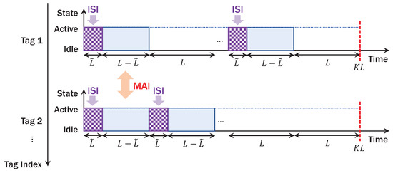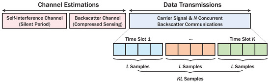 In the data transmission phase, an ambient signal from AP can be sliced into K time slots, each with L samples, to spread backscatter signals to increase signal-to-noise ratio (SNR) and reduce circuit-power consumption [2,5,6,7,26,48,49]. As RF tags employ predefined codebooks for data transmissions, active tags can immediately transmit data with low latency without resource allocation and scheduling procedures [34]. At time slot , the ambient signal with average transmit power can be expressed by