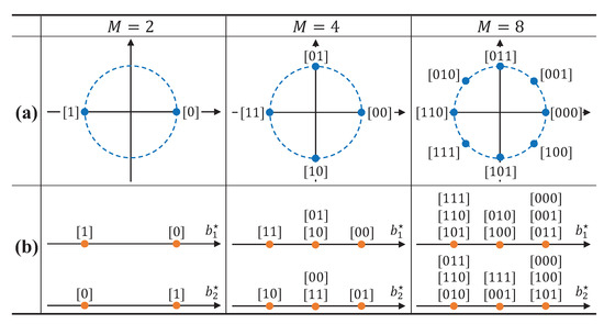 As described in Figure 4, these mapping functions satisfy the small-form factor requirement in RF tags. For instance, in conventional phase-shift keying (PSK)-based backscatter modulator, M constellation points are present in signal constellation with phase difference in Figure 4a [2]. Thus, the modulator requires distinct load impedances, inevitably increasing the size of RF tags. On the other hand, the SC-AmBC modulator only has three constellation points even for higher-order modulation. Accordingly, the required number of load impedances is , since a zero-constellation point is equivalent to the idle state of RF tag [26]. Although several constellation points can be overlapped in Figure 4b, symbols can be detectable as long as they are uniquely mapped in -dimensional signal space in Equation (11), even achieving modulation diversity gain [54] for reliable AmBC. Thus, high-order modulation can be implemented to typical binary PSK (BPSK) backscatter modulator, enabling a high data rate for a small-form factor passive RF devices such as biosensors and wearables.