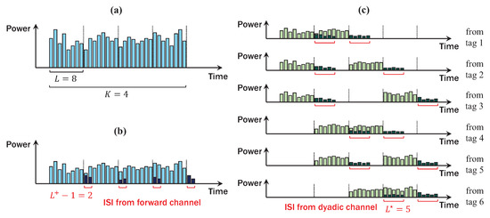 where the matrices and , respectively, denote the Toeplitz forward shift and backward shift matrices of size where the first column of and the first row of are given by and , respectively [23,50]. Due to delay spread, the received signal at tag n at time slot k can be expressed by superposition of k-th signals and -th signals such that