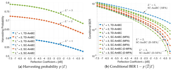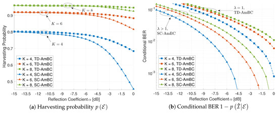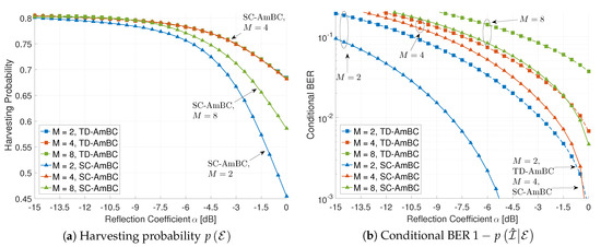 Figure 8 shows the effect of the modulation order M on the harvesting probability and the conditional BER. In a conventional TD-AmBC modulator, the harvesting probability is irrelevant to the value of M, since all the M-PSK symbols are on the circle of radius as shown in Figure 4a with in (7). Note that the reflection coefficient in the horizontal axis is related to SNR per symbol rather than SNR per bit. Consequently, as M increases, conditional BER in TD-AmBC degrades as the SNR per bit is reduced by factor [22].