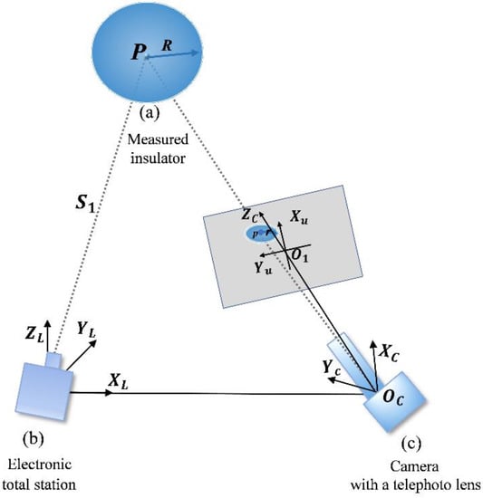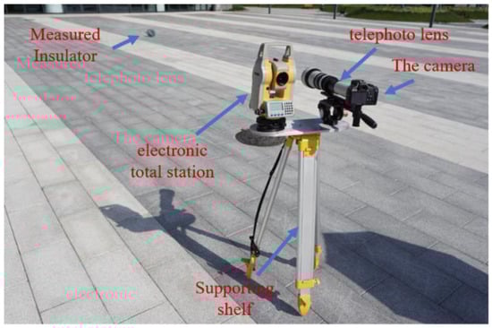 - Data collection: Construct the measurement system as shown in Figure 8. Next, adjust the electronic total station to make the laser precisely hit the metal handle of the insulator and then capture a clear image of the distant insulator on the transmission lines using the camera with a telephoto lens.