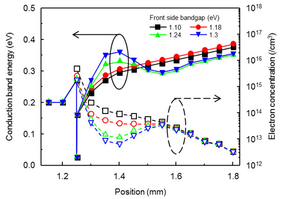 The electron and hole pairs generated by sunlight are separated and transferred to the opposite side. The movement of the carriers is greatly affected by the bandgap profile in the solar cells. The electron and hole pairs can be moved easily in the space charge region (SCR) where a high internal electric field is applied. Especially, the transportation of minority carriers in the CIGS absorption layer, and their movement over the band barrier at the interface of ZnS (due to electron affinity), are important causes for the conversion efficiency of the CIGS solar cells with ZnS buffer layers. Thus, the well-designed FGB of the CIGS layer could become the decisive factor determining the improvement in carrier transportation in the SCR. In particular cases, the FGB could disturb the carrier collection. Therefore, we investigated the conversion efficiency of the CIGS solar cell for the extent of the band gradient of the FGB structures. Figure 2 shows the conduction band and electron concentration profiles in the SCR of the CIGS at the steady state when the bandgap energies at the front edge are 1.1 eV, 1.18 eV, 1.24 eV, and 1.3 eV. The conduction band offset (CBO)—the mismatched alignment in the conduction band between the buffer and CIGS absorber layers—was measured from the J–V distortion curves under red light and dark illuminations [17]. We note that the shapes of the conduction band in Figure 2 were obtained from the J–V distortion measurement and the changes in CBO are very small for the front side bandgaps in our CIGS layers. The simulated results are presented in Figure 3 for the conversion efficiency parameters. As the front side bandgap increases from 1.1 eV to 1.37 eV, VOC gradually improves from 0.614 V to 0.648 V, but JSC and the fill factor (FF) decreases. As a result, the optimal front side bandgap is 1.18 eV in Figure 3. This can be attributed to the fact that the conduction band bending of the FGB helps the electrons to move over the band-offset of the ZnS interface barrier in the SCR for the low front side bandgap. However, for the high front side bandgap, a conduction band barrier forms near the interface of the ZnS buffer layer and disturbs the electron carrier transportation at the forward bias, so JSC and FF decreases gradually, as shown in Figure 3.