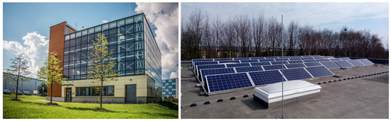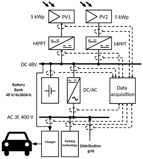 The parking slots in APS are equipped with a charging [27,30,31] system that enables charging electric cars on demand, or as required by the charge control system. The building is also equipped with photovoltaic power cells placed on the roof with total 10 kW peak (see Figure 1).