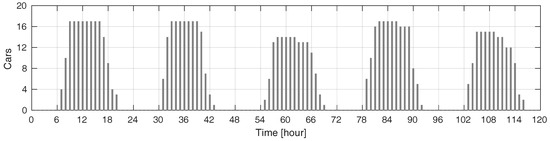 The occupancy data were transformed into time series, where each sample represented a number of cars that parked during a given 15 min period (see Figure 4). From these historical data, we were able to estimate the expected arrival and departure times for the following. The regular arrivals began from 5:45 a.m. to 11:45 a.m., with an average standard deviation of a car equaling to 32 min. The departures occurred in the interval from 12:30 p.m. to 9:45 p.m. with an average standard deviation of a car equaling to 75 min.