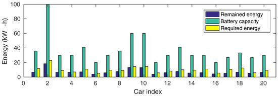 The amount of remaining energy of incoming car batteries was adjusted randomly with 20% mean and 15% standard deviation. The mandatory minimum to be charged was defined as the distance to driver’s home increased by an additional 25 km for any unexpected needs. The final amount was increased by an additional 50% to be prepared for worse weather conditions or other energy consuming circumstances. These constants for remained energy simulation were chosen with pessimism. The levels of batteries of each car may be seen in Figure 5, where the maximum capacity is accompanied by the current amount of energy as well as the desired energy to be charged. The final desired amount of energy was computed in two scenarios—the amount of energy with and without respect to the current battery level (final SoC was equal to the required SoC () or to the final SoC was decreased by current SoC ()).