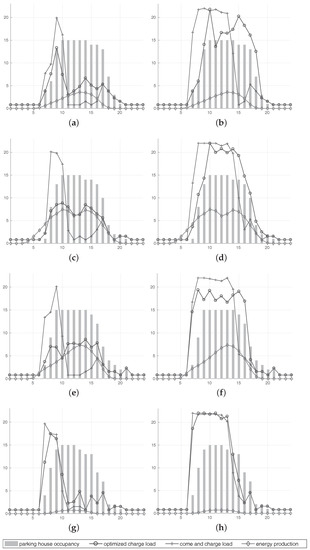 The comparisons of optimized loads vs. come’n charge loads on four different months ((a,b) March, (c,d) June, (e,f) September and (g,h) December) and both consumption modes ((a,c,e,f) reflect consumption lowered by the current battery state while (b,d,f,h) are not taking this into account). In all figures, the horizontal axis represents time in hours (1 day) and vertical axis means the absolute values of depicted measures (number of cars and kW·h).