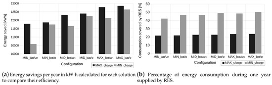 Energy savings acquired for different system configurations having optimized and unoptimized simulations. Shortcut ’ru’ means percentage of renewable energy used and ’cl’ means the percentage of covered load by RES. Outcomes in this table were computed on lower charging scenario—not taking the current battery balance in car.