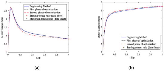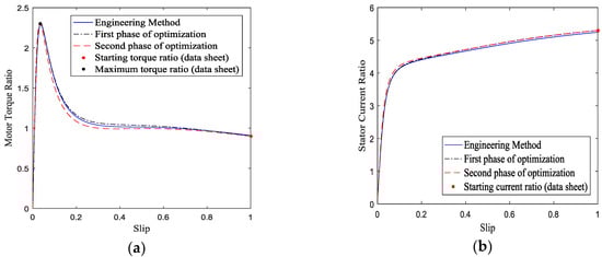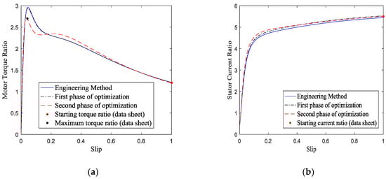 The goal of the model parameter optimization is to minimize the errors between the calculated values and the real manufacturer values. In this study, the focus is given to the starting current ratio (), starting torque ratio (), and the pull-out torque ratio (). Define