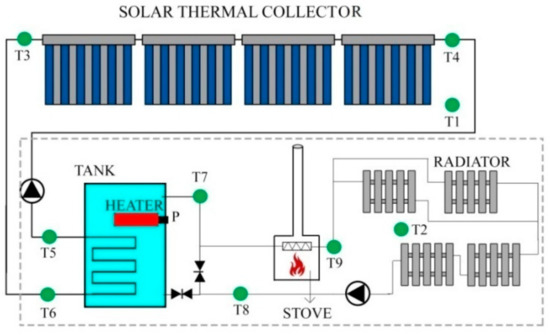 A controller of the triple system governs a solar circuit pump, a radiator circuit pump, and the electric heater in the tank based on the operating conditions. The solar circuit pump is directed by a temperature difference function: When the temperature difference between the fluids flowing through the supply and return pipes reaches the switch-on temperature difference, the solar circuit pump is triggered; and when the temperature difference reaches the switch-off temperature difference while pumping the fluid, the pump is automatically stopped. The radiator circuit pump is also directed by another temperature difference function to address the internal temperature. The electric heater in the tank is directed by both time and temperature difference functions: when the temperature of the tank reaches a maximum value, if the time function is still active, then the electric heater is stopped; and when the temperature of the tank reaches the minimum value, the electric heater is triggered regardless of any adjustment of the time function. The stove is operated manually, usually in the morning (approximately 7:00–9:00 a.m.) and in the evening (approximately 6:00–9:00 p.m.) during cold periods.