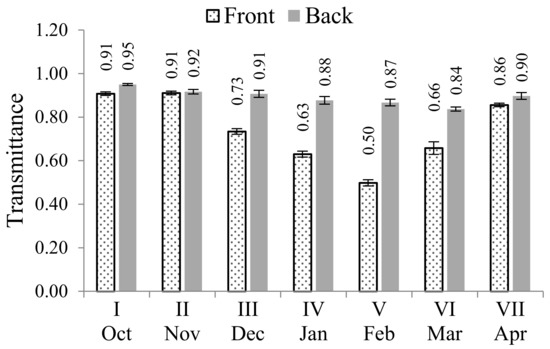 The dust deposition behavior on glass tubes of an evacuated tube solar collector was investigated by the authors of the current study [15]. The authors conducted long-term dust deposition tests between October 2015 and May 2016; gathered environmental data such as PM10, rain, snow, cloud, wind speed, and direction during that period; and modeled daily change in transmittance of the glass tubes. One set collector, including 30 evacuated glass tubes, was used for the tests and situated next to the solar collector system. Half of the tubes were exposed to actual environmental conditions for various periods, in steps of 28 days, to determine the long-term dust deposition behavior. After the exposure process, the transmittance values of all the exposed glass tubes were measured from the back and front sides using pyranometers with an accuracy < ±5%. The measurement results are shown in Figure 3. Transmittance of the glass tubes decreased until February and then increased up to almost the initial value by May, when the measurements were performed from the front side. When the measurements were performed from the back side, the transmittance of the glass tubes was quite steady. These results indicate that the front side is easily contaminated by airborne dust and cleaned by rain and snow, whereas the back side is neither contaminated nor cleaned easily.