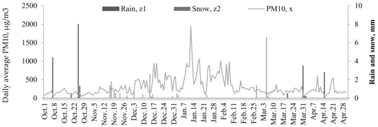 Daily average airborne dust (PM10), daily total rain and snow rate.