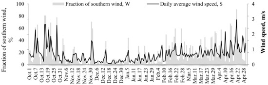 Figure 5 shows the daily average wind speed and the daily fraction of the wind that blew from the south, southeast, and southwest. The fraction is calculated as expressed in Equation (2). The daily average wind speed was high in spring and autumn and low in winter. This phenomenon was similar to the data measured by weather stations for several years.