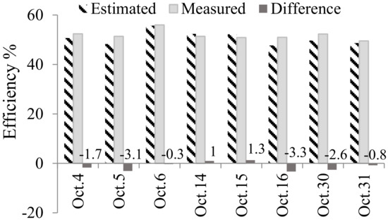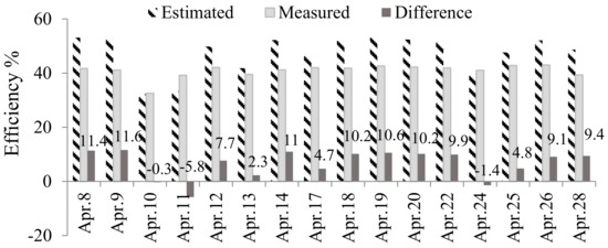 The relative uncertainty associated to the collector measurement efficiency was <6% in October <16% in April. Figure 7 and Figure 8 report the experimental and predicted daily thermal efficiencies during October 2015 and April 2016, respectively, as a function of the day. The differences between the estimated and measured values were generally lower than 11% in terms of daily efficiency during those months.