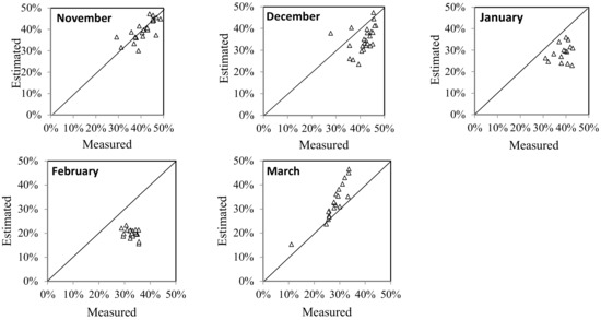 Since the TRNSYS model was considered to have been validated, the dust deposition model was embedded into the validated model in order to calculate daily efficiencies of the collectors during the rest months between January 2015 and March 2016. Among the dust deposition behaviors plotted by Equations (3)–(5), the behavior plotted by Equation (5) was chosen for the future calculations, because when Equation (5) was employed, the error between the performance calculated by TRNSYS and the actual measured performance was minimal from the available results. The correlations between the estimated and measured daily collector efficiencies during each month are shown in Figure 9.