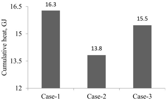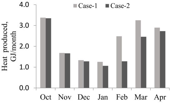 Figure 10 shows the monthly total thermal outputs of the collectors with daily cleaning (Case-1) and no cleaning (Case-2, which used the daily change in transmittance plotted by Equation (5)). The Case-1 results show that more energy (2.5 GJ) is produced compared with that of Case-2 during the duration of heating from October until May. The biggest difference in monthly performance of 1.2 GJ was observed in February.