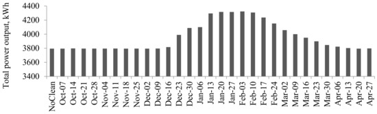 Using the step of 7 days, TRNSYS was run 31 times in total. Thus, 31 different days between October and April were chosen as test days to evaluate the best cleaning day. The results of the cumulative recovered heat values from October to April according to the cleaning date are shown in Figure 11. The highest values of cumulative recovered heat were observed when the cleaning was performed between 13 January and 10 February. This finding can be explained by considering that the air pollution reached the maximum rate during the measurement period on 12 January, and that the total precipitation rate in January and February was 2.8 mm, which represented only 7% of the total precipitation that fell during the measurement periods.