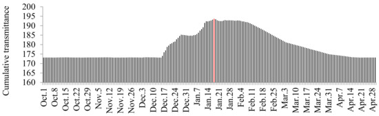 In addition to the cumulative heat, the cumulative transmittance was calculated by changing the cleaning day one by one between October and May to evaluate the best cleaning time. The results are shown in Figure 12. In this case, a higher cumulative transmittance value was observed in the same period as that of the cumulative heat, with the highest value observed on January 18. The transmittance behavior observed when the solar collector tubes were cleaned on January 18 is shown in Figure 13 (the daily change in transmittance was calculated with Equation (5)).