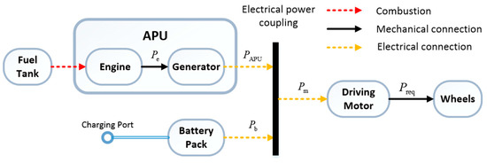 The extended-range electric bus studied here is the inter-city passenger car travelling between Changchun and Shenyang, and its powertrain structure is showed in Figure 1. The E-REB is powered by an auxiliary power unit (APU) and a battery pack. The APU consists of the engine and the generator, while the engine drives the generator to generate power. The output power of the APU is coupled with that of batteries, and the electric power is converted by a driving generator to machinery power, and then the main reducer and the differential further transfer the energy to the wheels. The parameters of main vehicle components are listed in Table 1.