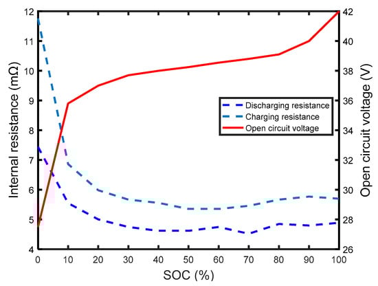 The battery pack consists of 156 battery cells in series, the total capacity of which is 300 Ah and the rated voltage is 576 V. Then ten battery cells in series are selected and tested at ambient temperature 25 °C. The data of charge/discharge resistance, open circuit voltage (OCV) and SOC from the ten cells are fitted in Figure 2.
