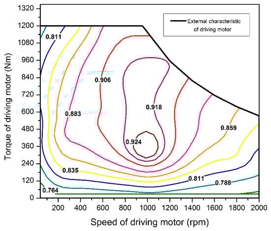 This extended-range electric bus is driven by a permanent magnet synchronous motor, and its efficiency map at the rated power is showed in Figure 3. The driving motor efficiency at given rotating speed and torque could be determined by the lookup-table interpolation method. When the driving motor works as a generator (braking energy recovery stage), the efficiency map is symmetrical. The efficiency of the driving motor is: