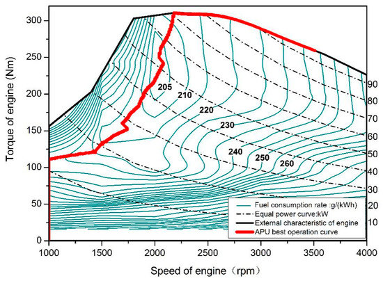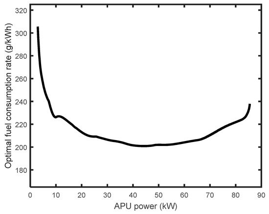 The universal characteristics and APU optimal operation curve of the engine are shown in Figure 4. Unlike the optimal working curve of the engine, that of the APU is integrated the generator efficiency. The minimum fuel consumption of each disperse power was plotted in Figure 5. Since the maximum output power of APU is 85 kW, the fuel consumption rate is very low when the output power of APU is 40–50 kW. Since the optimal working point of each discrete power is only and known, the rotating speed and torque of a working point can be determined if the allocation power of APU in the energy management algorithm is known.