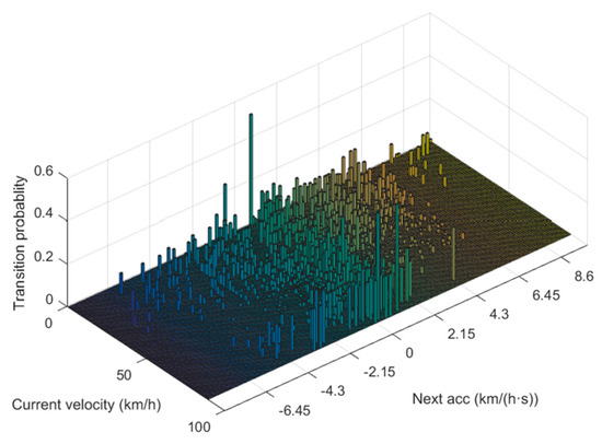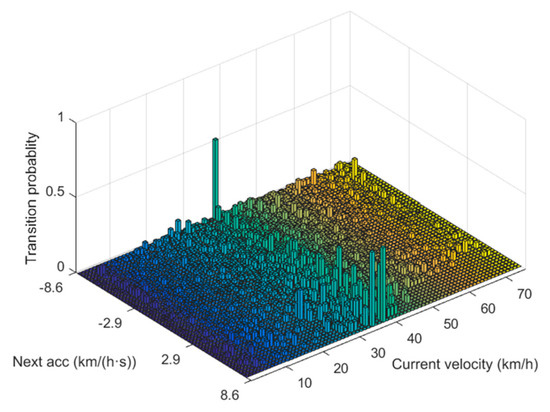where pij is the transition probability from the current vehicle speed νi to the acceleration aj of the next state; Nij is the number of occurrences of the event where the current vehicle speed νi reaches the acceleration aj of the next state; is the total number of event occurrences of the current vehicle speed νi reaching the acceleration of the any next state.