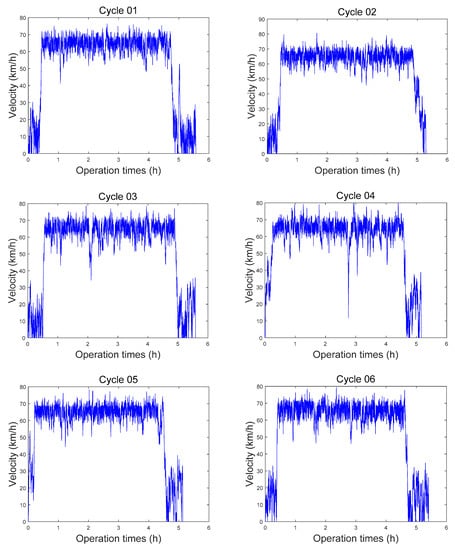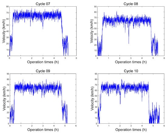 Taken together, the driving cycles are generated segment-wise by using the Markov probability transition matrix. To simulate the variation of each driving distance during real driving, a random error δ ∈ [0,5%] is introduced. When each segment of driving cycle is generated, the effect of random error is considered. Based on the above conditions, in Figure 8, 10 simulated driving cycles (Cycle 01~10) are formed and used to determine the energy management strategy parameters and validate the control effect. The specific statistics of driving cycles and the solution results of PMP will be introduced in Section 5, and the solving process of PMP will be illustrated in Section 6.