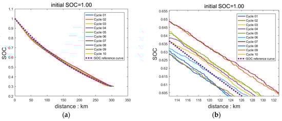 The commonly-used SOC reference curve is SOC-distance linear curve [34]. However, in real situations, the SOC-distance is not completely linear, and thus this reference curve is blind to some extent. A segmented SOC reference curve is designed according to the changing curves under different initial SOCs of 10 cycles solved using PMP: