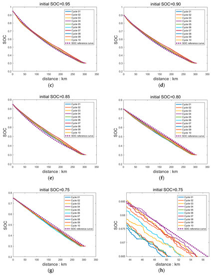 The SOC change curve of 10 cycles under optimal solution by PMP in different initial SOC: Among them, (b) and (h) are (a) and (g) partially enlarged image, respectively.