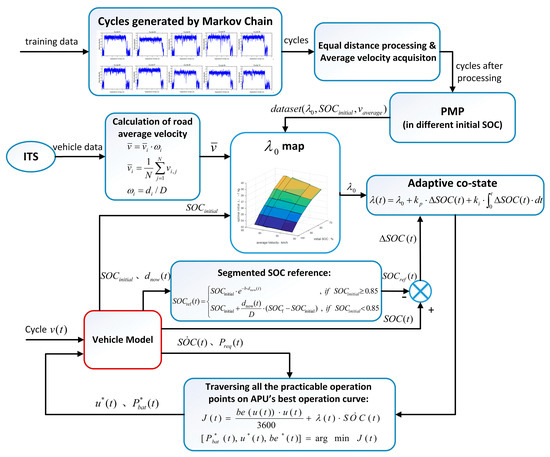As a summary of the above flowchart, the architecture of A-ECMS is shown in Figure 11. Firstly, data of representative driving cycles and collected data are used to generate a city-highway probability transition matrix, and with Markov chain, the target driving cycles are formed. The equidistance driving cycles are solved by PMP, forming the optimal co-state initial values under each driving cycles with different initial SOC, forming a map. In real-time operation, the ITS data are weight-averaged, and together with the initial SOCs provided by the BMS system, λ0 is determined from interpolation. A vehicle provides information of real-time driving distance, demanded power, SOC and its changing rate. With the segmented SOC reference curve established from real-time follow-up as the goal, the adaptive λ is adjusted through PI control. Within the range of constraint conditions, the optimal working curve of APU is traversed so as to solve the minimum value of the target function J. Finally, the optimal APU and the battery allocation power are determined, and substituted into the whole-vehicle model for control.