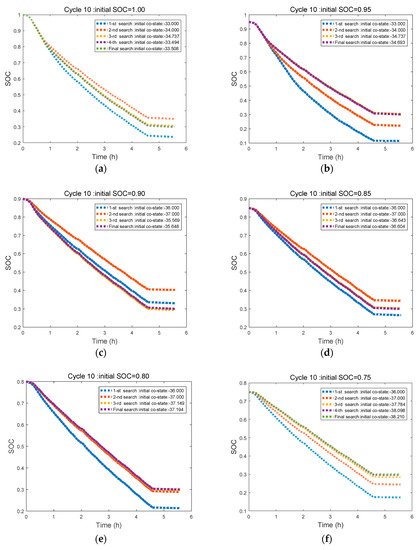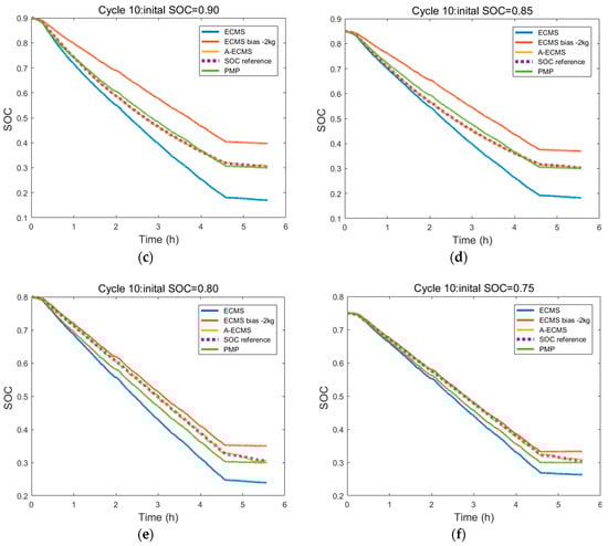 The strategies comparison under different initial SOC (Cycle 10): (a) SOC = 1.00; (b) SOC = 0.95; (c) SOC = 0.90; (d) SOC = 0.85; (e) SOC = 0.80; (f) SOC = 0.75.