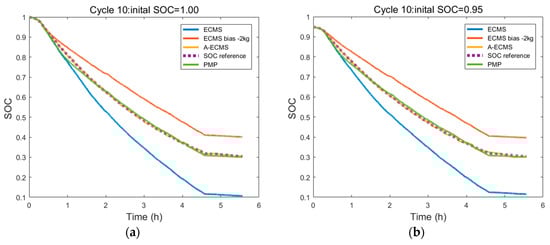 In this study, the global optimization algorithm PMP, and its derivative instantaneous algorithms C-ECMS and A-ECMS are introduced. In this section, the three energy management strategies under different initial SOCs and the 10 generated driving cycles are compared. As shown in Section 6.1, during the solving process of PMP, when the initial SOC is 1.00, the changing range of co-state is about −3.5 kg; when the initial SOC decreases, the changing range of co-state becomes narrower; when the initial SOC is 0.75, the changing range is about −1.5 kg. In C-ECMS, the co-state is always the initial value. To illustrate the effect of the initial value of co-state on the effect of C-ECMS, we select two initial values with the bias of −2 kg. In the adaptive co-state function, the proportionality factor kp is 0.2, and the integral coefficient ki is 0.004. For Cycle 10 for instance, the simulation map is shown in Figure 14.