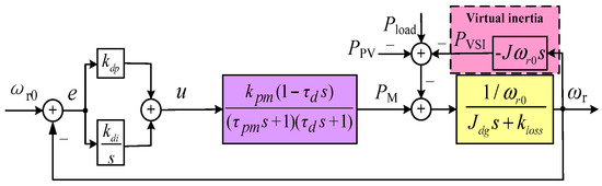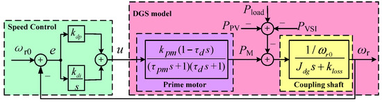 In Figure 2, Jdg is the rotating inertia, ωr is the rotor angular speed, and kloss represents the rotational losses, ωr0 is the synchronous speed, PM is the mechanical power supplied by the prime motor, kpm concentrates the gain of fuel injection system and diesel engine, τpm is the time constant of the fuel injection system, τd is the dead time of the diesel engine, kdp and kdi are the proportional and integral factors of a PI controller. The parameters of a 26 kW DGS obtained from [25] are shown in Table 1.
