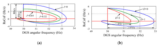 The angular frequency-acceleration trajectories of simulated DGS are shown in Figure 6. The advantage of adding the virtual inertia is the reduction of the RoCoF due to a power disturbance. For J = 0.64 kg·m2, the maximum RoCoF is reduced from 8 Hz/s to 4 Hz/s, as can be seen from Figure 6a. From Figure 6b, it can be seen that the advantages of increasing the virtual damping are the attenuation of the amplitude of the oscillations of the frequency and the reduction of the MFD. For D = 2, the MFD is reduced from 2.85 Hz to 1.4 Hz.