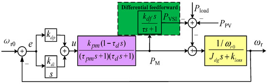 where kdf is the differential feedforward gain, and τ is the filtering time gain of the low-pass filter (LPF). The active power is typically calculated from the time derivative of the DGS mechanical power that can expand the noise that is usually contained in this power. Hence, a LPF is applied to prevent the excessive noise from polluting the system. Figure 7 is the block diagram for speed control with the differential feedforward of the DGS output current control loop.