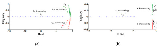 Traces of the three eigenvalues as a function of (a) differential feedforward gain: τ = 0.3, 0 ≤ kdf ≤ 2; (b) filter time gain: kdf = 1, 0.1 ≤ τ ≤ 0.96.