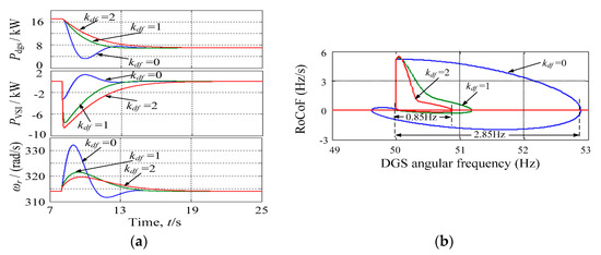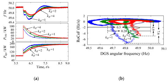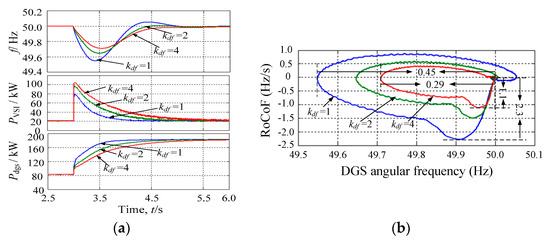 On the other hand, when the dynamic frequency support is complemented by the differential feedforward control loop (with kdf = 1, kdf = 2, and kdf = 4), the VSG outputs dynamic active power. As a result, both the MFD and the RoCoF are decreased, as shown in Figure 19b. For kdf = 4, the MFD is reduced from 0.5 Hz to 0.28 Hz, and the maximum RoCoF is reduced from 7.6 Hz/s to 4.9 Hz/s.